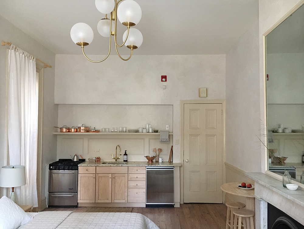 What took so long? To start, we had almost no time to be in Philly. But we also ended up tearing out a couple closets, panelling that back wall, spiffing up the roof deck with huge planters and plenty of plants, and having a new wall AC installed. We also refinished the original wood floors and uncovered original hex tile in the bathroom, which all needed to be grinded down to remove a thick layer of who-knows-what that had accumulated over the past century. Once we’d done all that, it seemed a shame not to go all the way and give it our usual treatment of leaving no surface untouched. Five months later, we’re done!