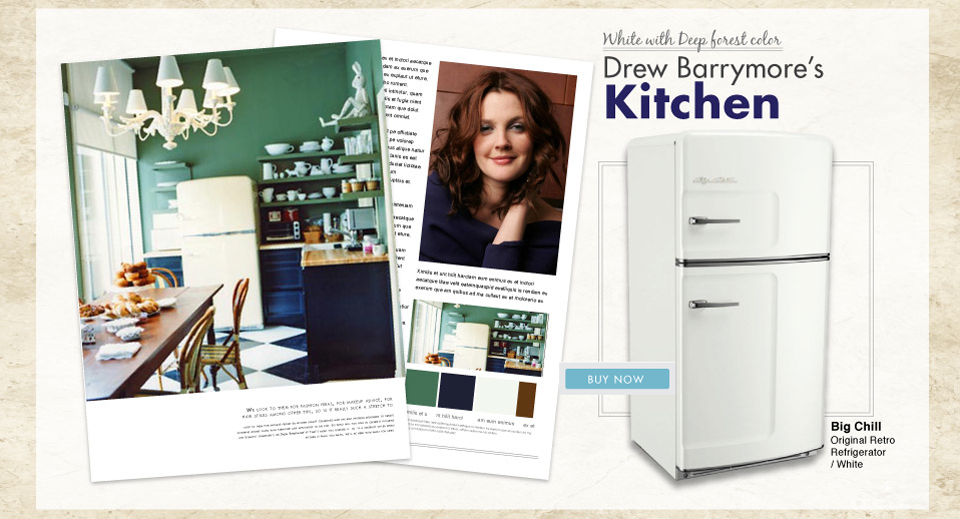 Enter Big Chill Fridge! Well, twelve years ago–I’m a little late on this one. But how awesome are those colors? Not only do they have normal-person-size and Smeg-size fridge-slash-freezers, they also have ranges and range hoods and dishwashers and microwaves. Check out Drew Barrymore’s kitchen below!