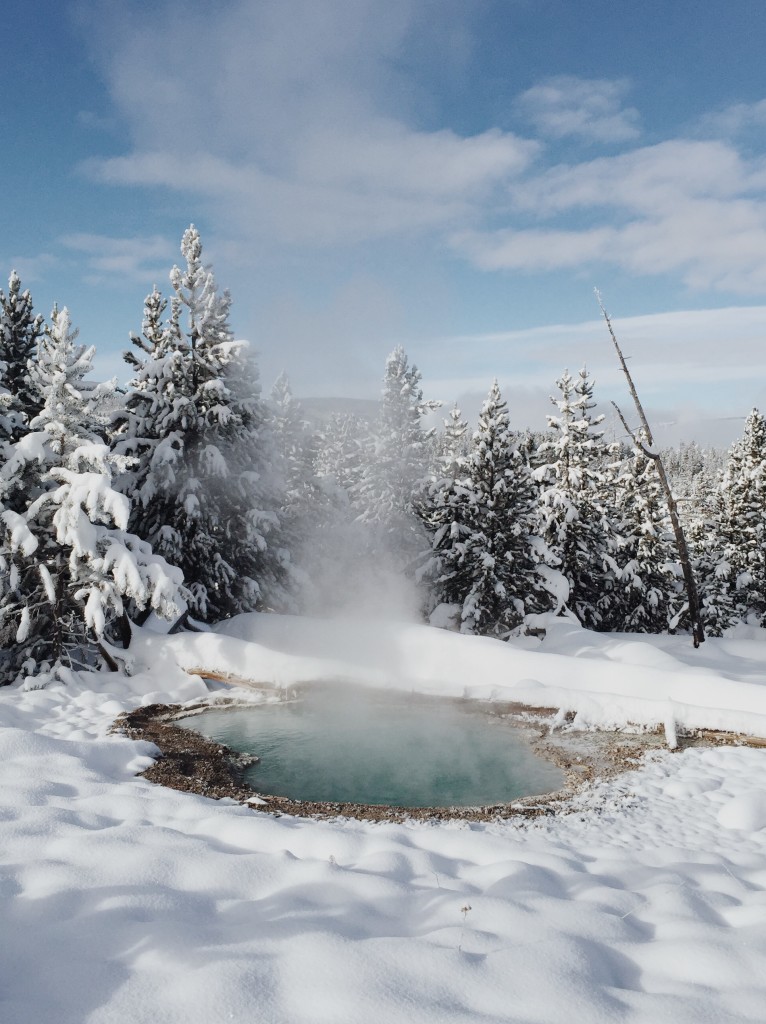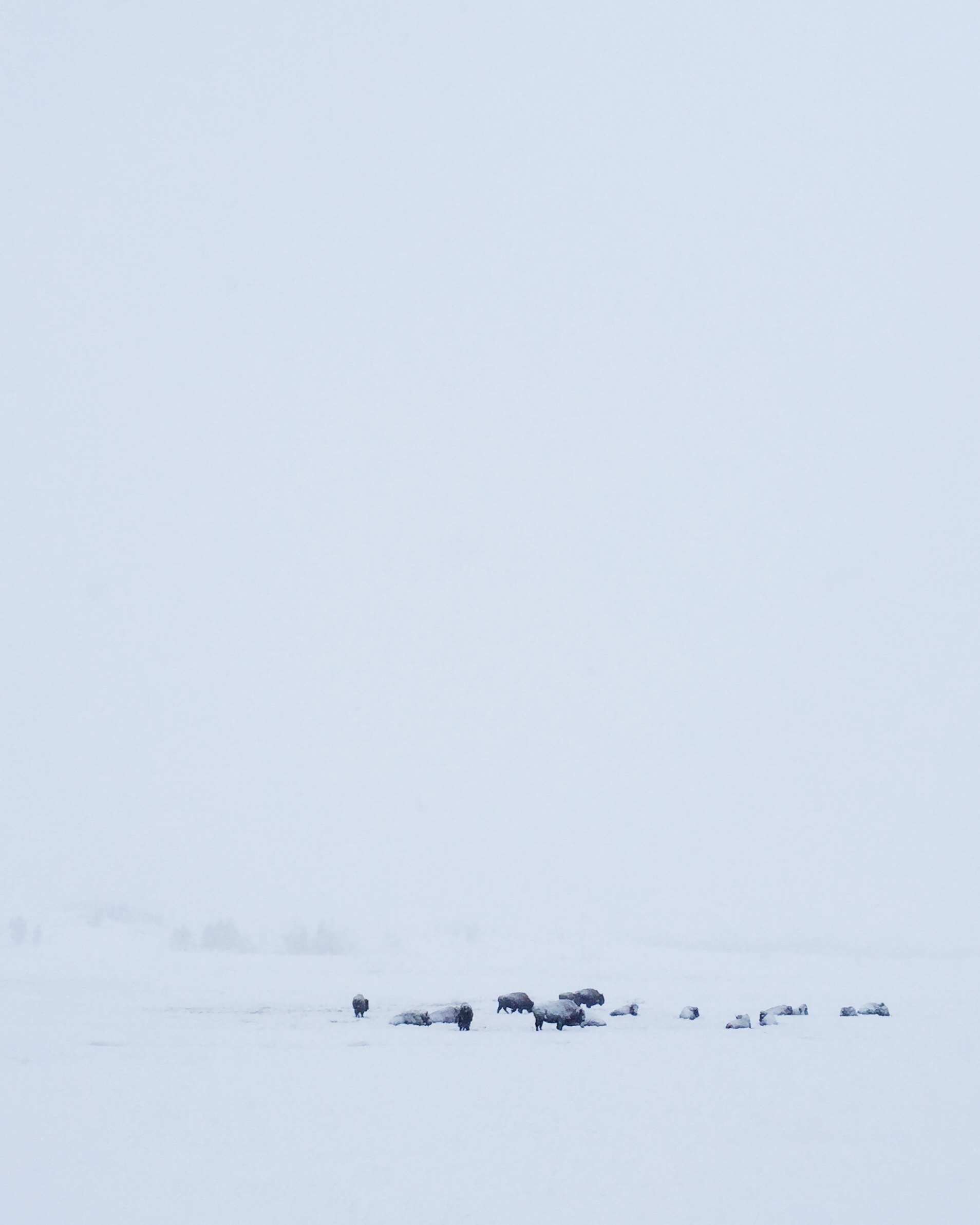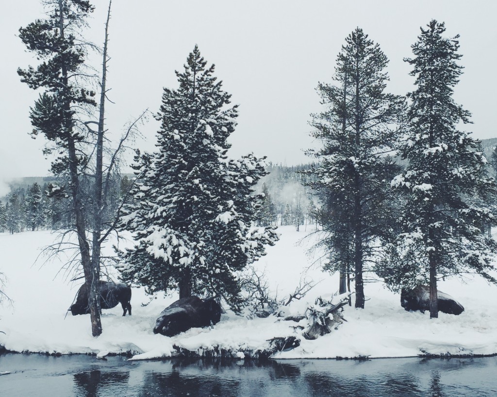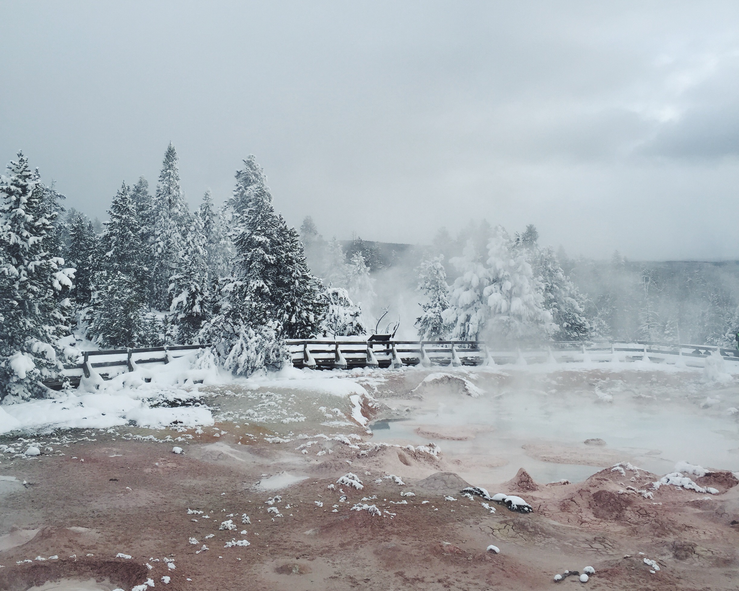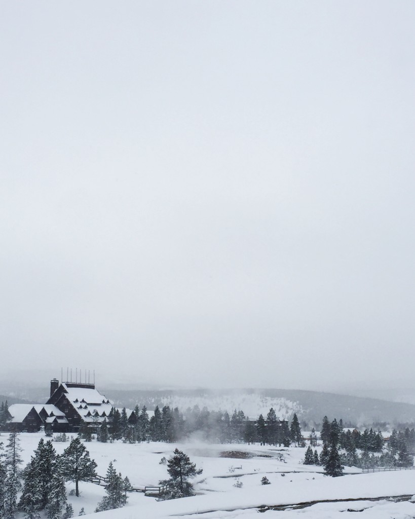 My mom and I were lucky enough to spend Christmas week in Yellowstone. It was the best. We rode all over the park in old 70s Bombardiers that would make Wes Anderson jealous. We went of a night tour of Fountain Paint Pots under the stars. We saw five wolves, a coyote, two otters playing together in an ice cold river (there was literally ice floating past them), and more elk and bison than we could count.