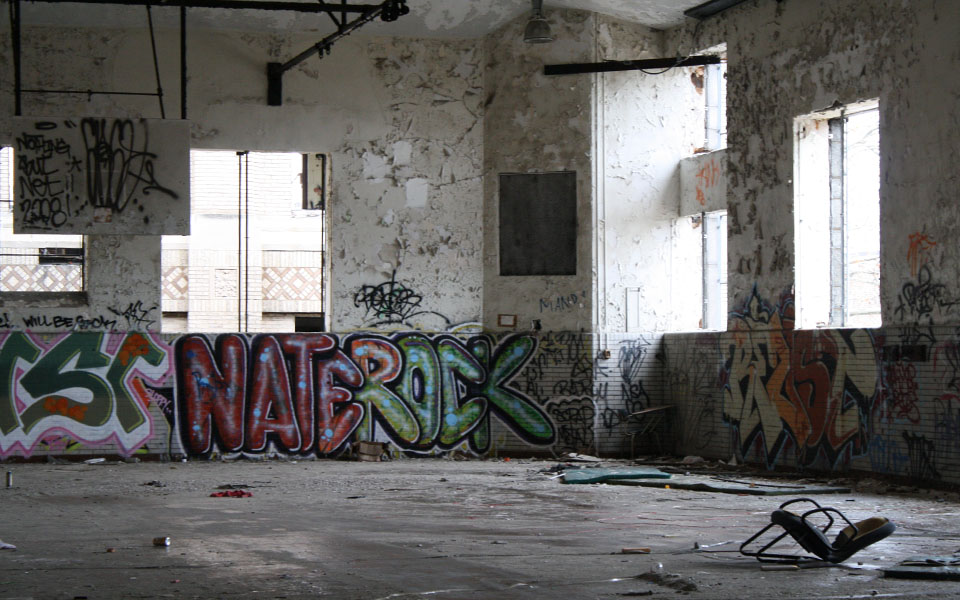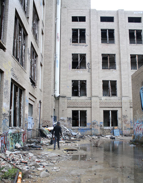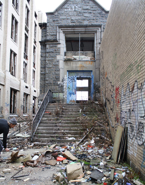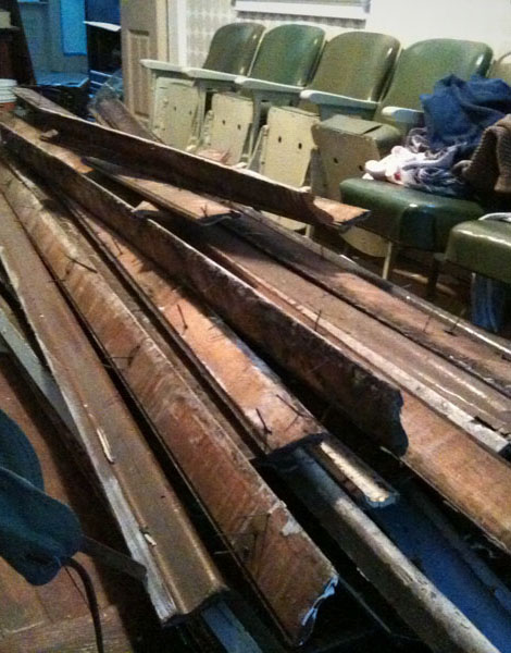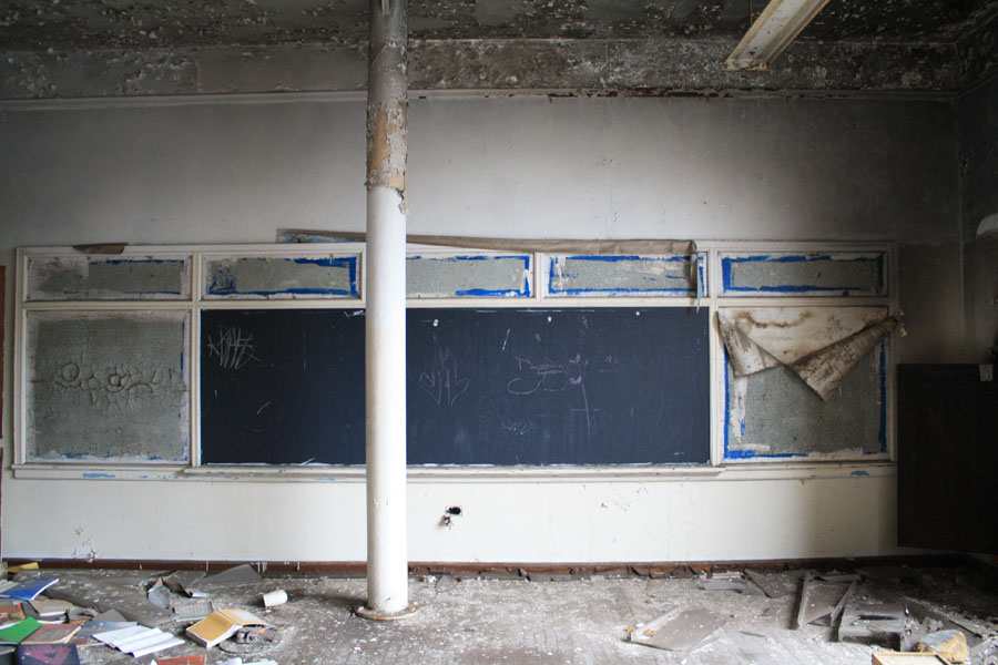 The first step was salvaging all the wood, which I did solo one snowy winter day a couple years ago. A friend of a friend had shown me this amazing abandoned school in North Philly. It had been sitting for years, slowly falling to ruin at the hands of kids, scrappers, and the weather. It was slated for demolition any day (but actually took another year or two), so I didn’t feel too bad about trying to preserve some of the unbelievable craftsmanship that had gone into building the place. (School photos from a different mission on a different day, thanks to Hilly Cribben!)