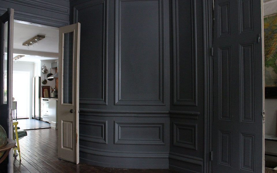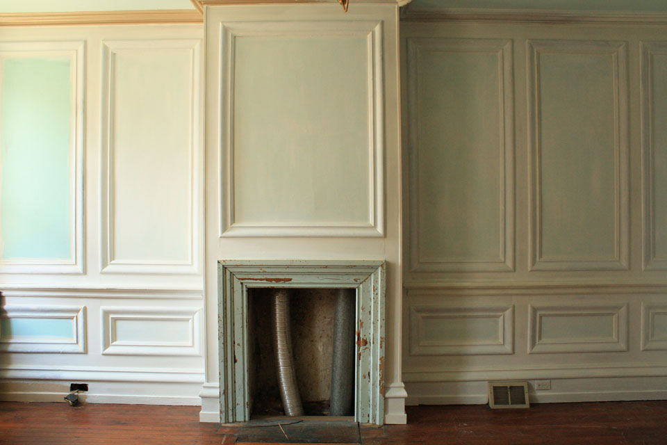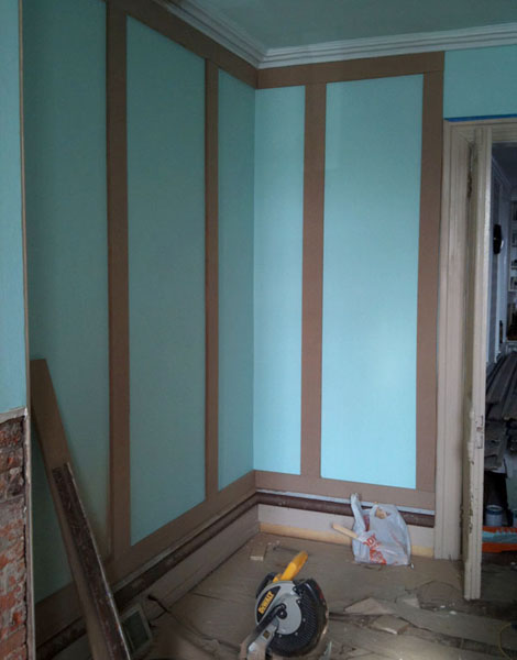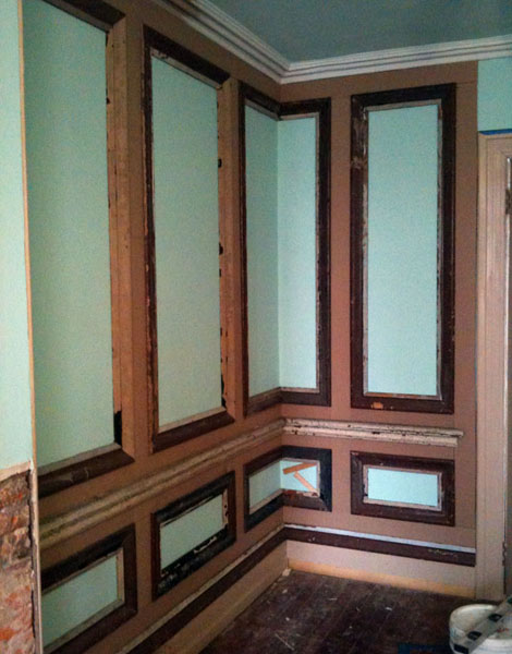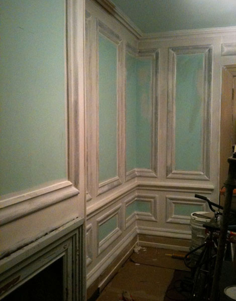 Anyway, here’s a project from a couple years ago! My personal favorite actually, and one that we did manage to photograph while it was happening. And thank god we did. I don’t know exactly how many hours it took altogether, but I’d guess at least a hundred. I still can’t believe it’s done. And that I did it. Everything from pulling hundreds of feet of thick old oak basecap molding (yes, oak!) out of an abandoned school in North Philly to spraying on the final coat of paint. None of it was easy, but the final result was worth every second. I doubt most visitors even realize that molding hasn’t always been there.