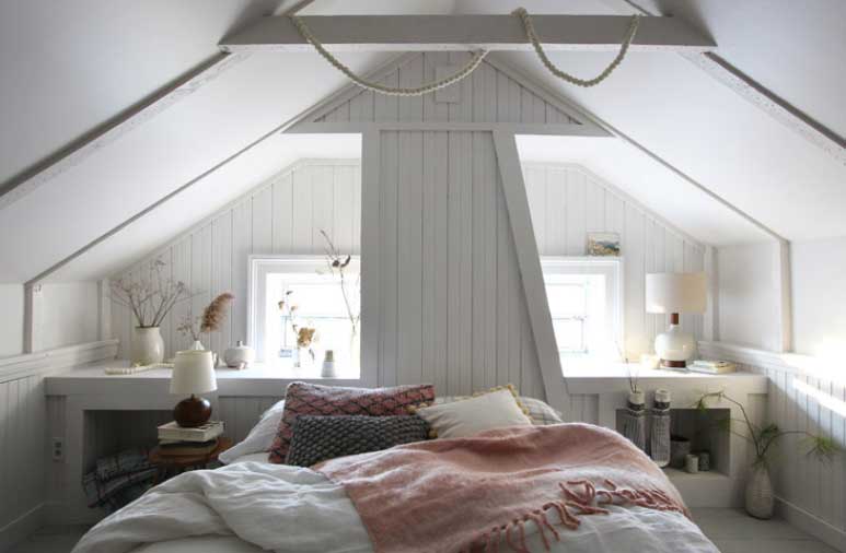 On either side of the chimney, we added matching built-ins to provide some extra storage and the sense of an extended headboard, since anything wider than a twin bed would have been wider than the chimney. Then we flipped the bed around, lowered it a few inches, made those cabinet doors work without sticking, and sprayed everything but the floor a nice super-light gray. Tara added the finishing touches courtesy of West Elm and made it look gorgeous. Now if we can just get a tree up there, we won’t want to leave till after Christmas!