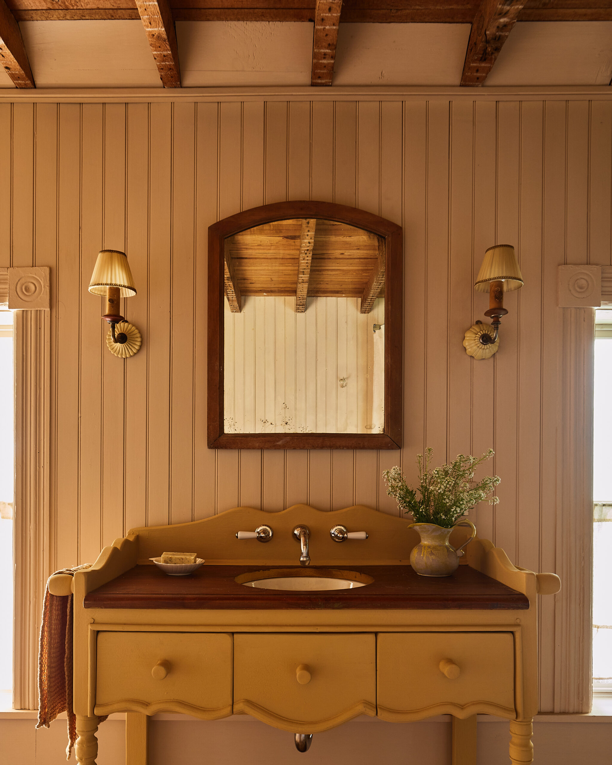 A kitchen decked out in orange granite countertops and other McMansion features is no place for Saveur’s Best Food Photography Blogger. Beth had pinned roughly a million images before we started working on the place, so we were really able to hit the ground running. We managed to keep the existing cabinet frames by altering them, making new doors, and giving everything a fresh coat of paint. We popped in a “new” old window and built a custom range hood, plus floating shelves from reclaimed late-19th-century factory beams, and an island and additional table from old barn siding. Beth went to Atlanta to pick out a slab of marble for the counters and had a beautiful Lacanche range delivered. Then we finished up with plastered walls (half polished, half hand combed), antique brass drawer pulls from Restore in Philadelphia, and a beautiful old French faucet Tara found on eBay.