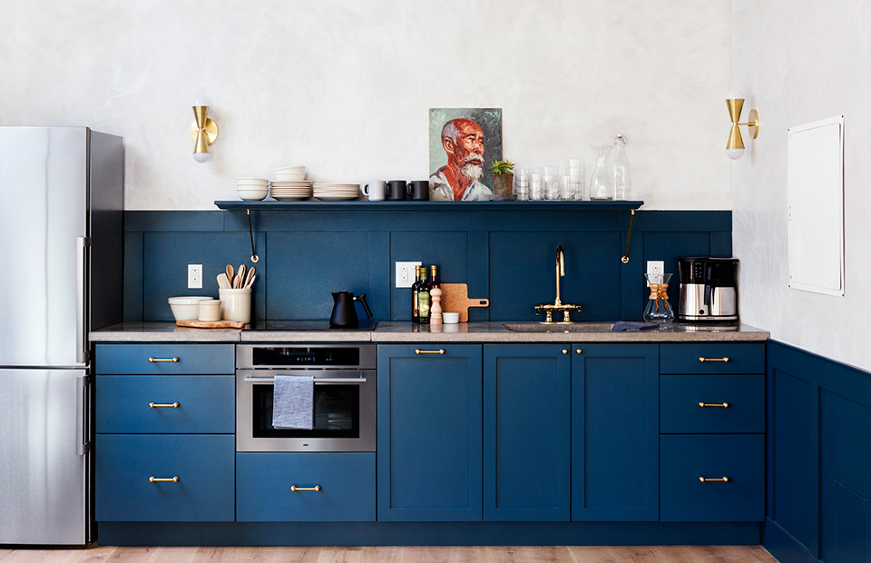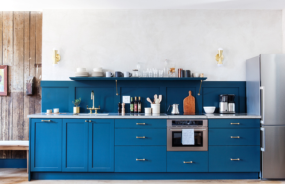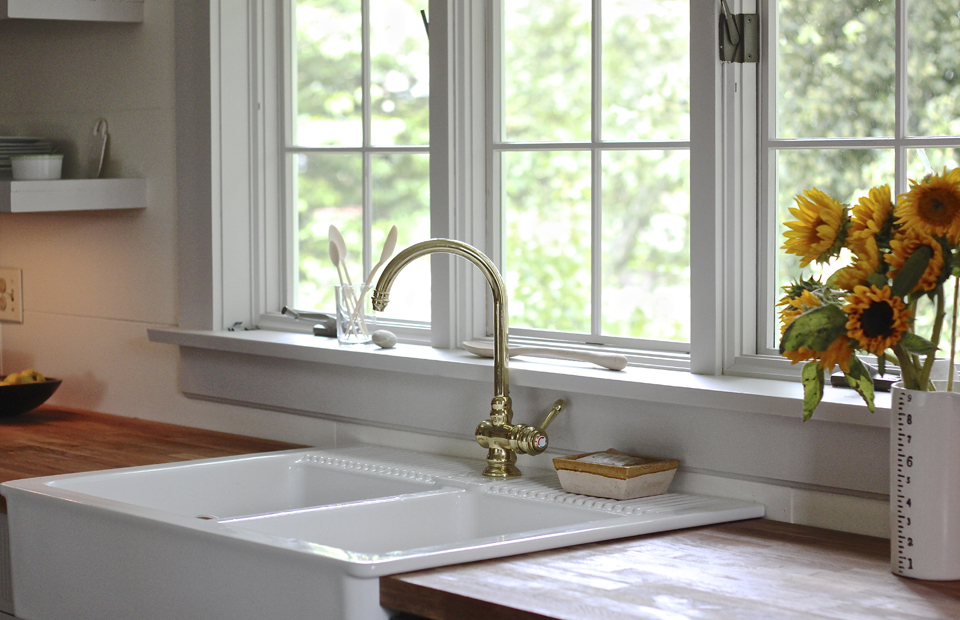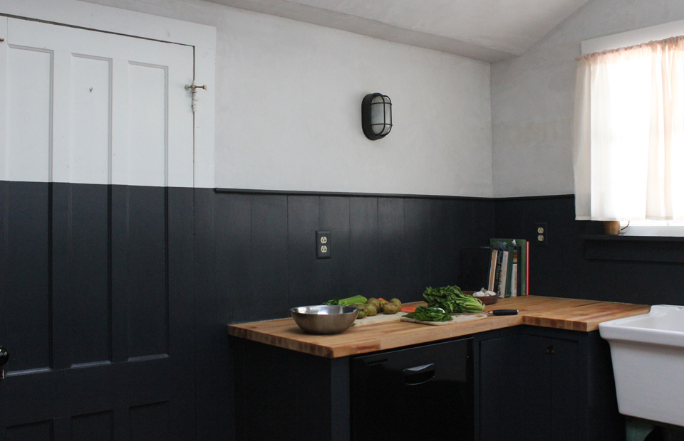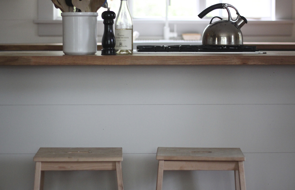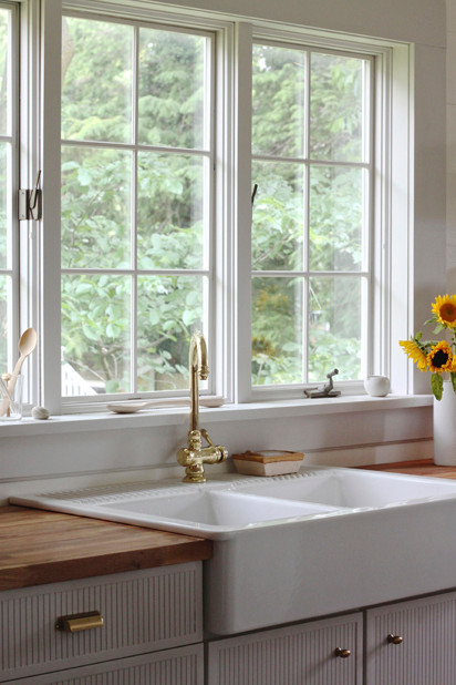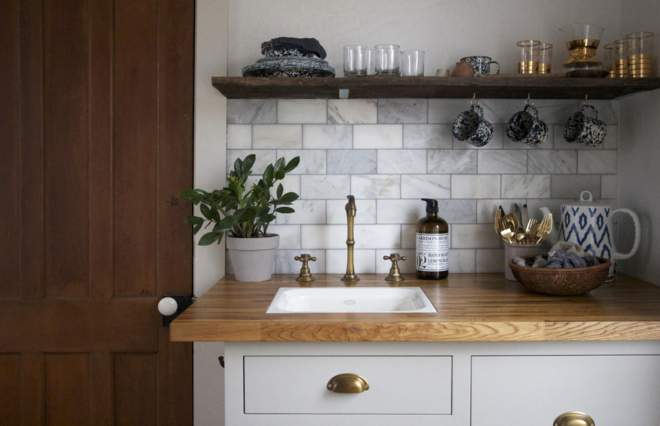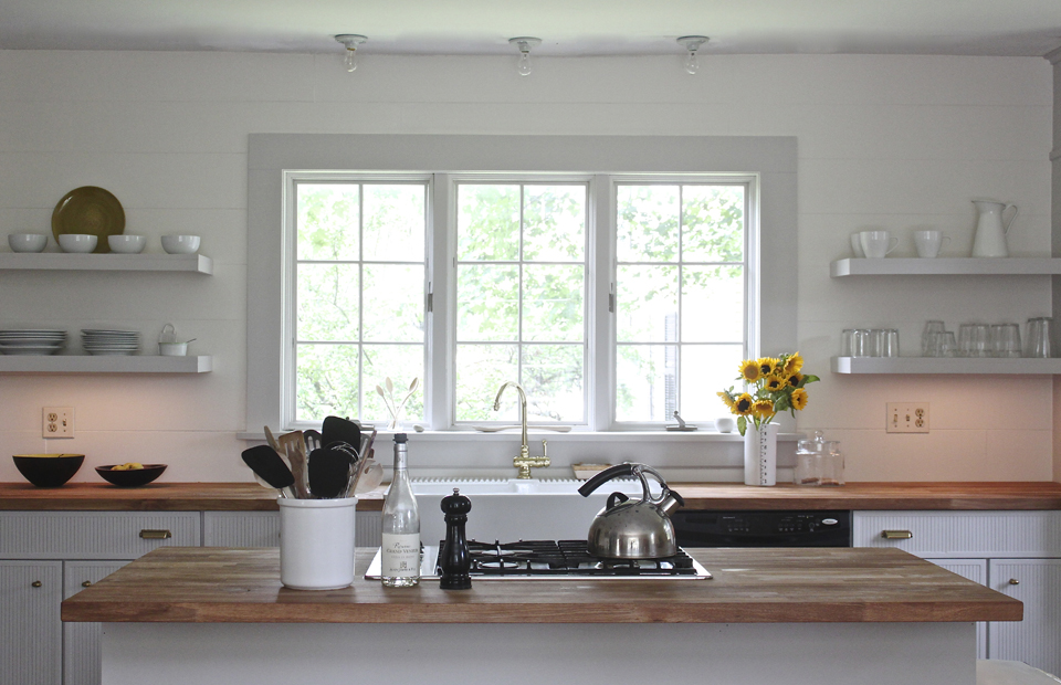 We were super honored when Justine Hand, one of Remodelista’s editors, got in touch and wanted us to give her kitchen a quick facelift. Though a full renovation wasn’t in the cards quite yet, she’d lived with the orange cabinets and orange granite counters long enough. It was time for the orange to go. The base cabinets had nice lines, so we kept them and gave them a fresh coat of paint, but we tore out the wall cabinets and the countertops in favor of open wall shelving and butcher block countertops. We added shiplap behind the sink and a chair rail to the extremely large room to tie everything together, plus we swapped out all the old hardware, the faucet, and light fixtures. Voila!