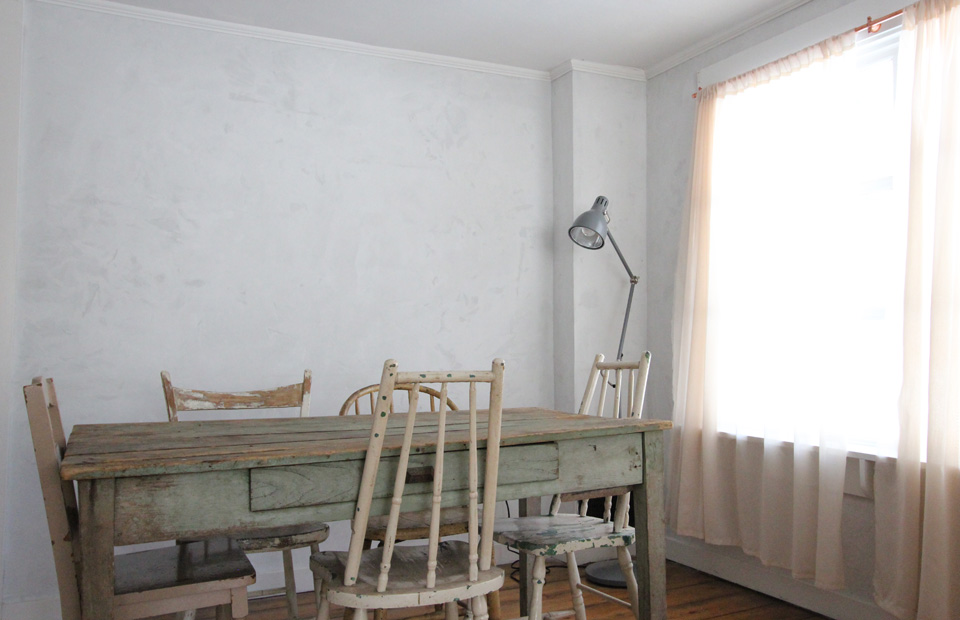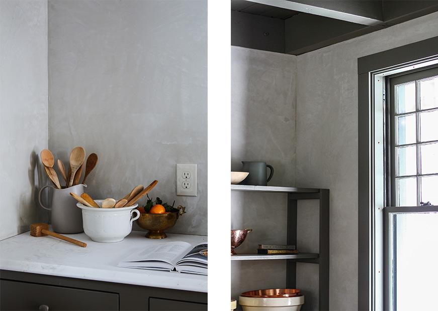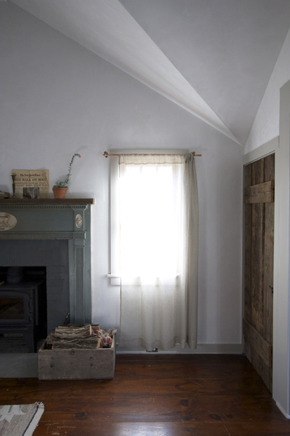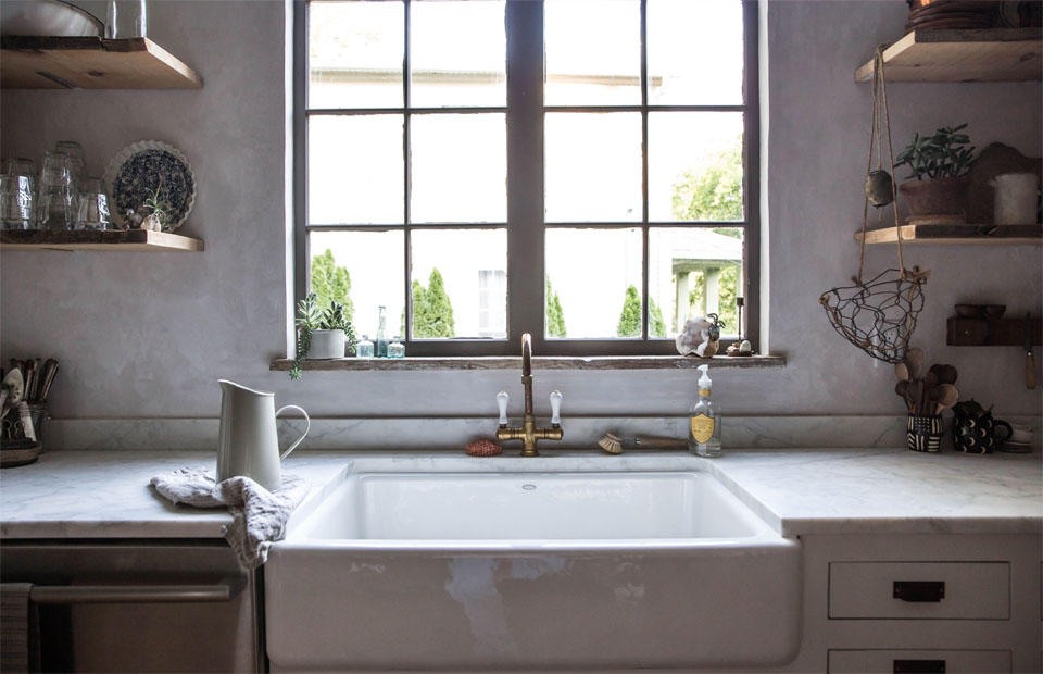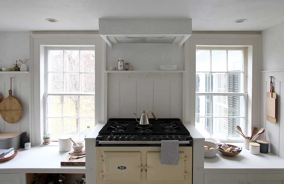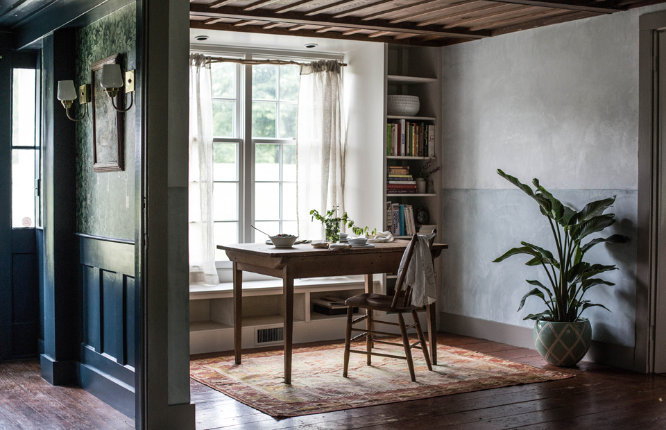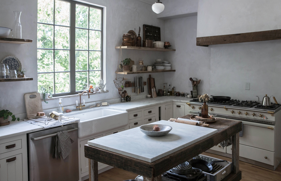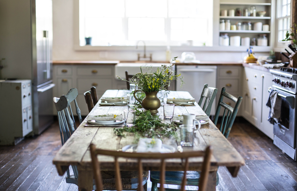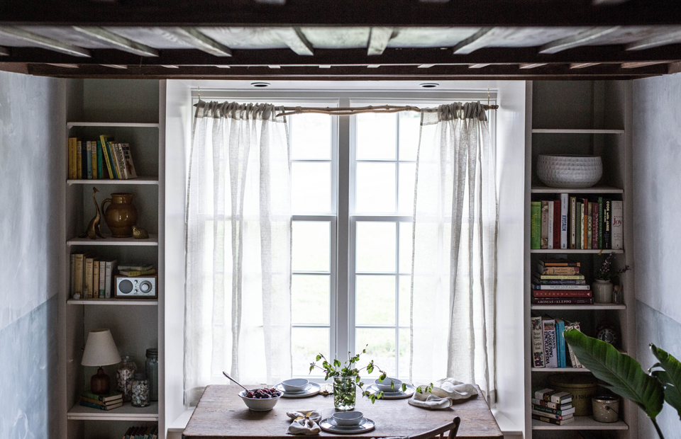 A kitchen decked out in orange granite countertops and other McMansion features is no place for Saveur’s Best Food Photography Blogger. Beth had pinned roughly a million images before we started working on the place, so we were really able to hit the ground running. We managed to keep the existing cabinet frames by altering them, making new doors, and giving everything a fresh coat of paint. We popped in a “new” old window and built a custom range hood, plus floating shelves from reclaimed late-19th-century factory beams, and an island and additional table from old barn siding. Beth went to Atlanta to pick out a slab of marble for the counters and had a beautiful Lacanche range delivered. Then we finished up with plastered walls (half polished, half hand combed), antique brass drawer pulls from Restore in Philadelphia, and a beautiful old French faucet Tara found on eBay.