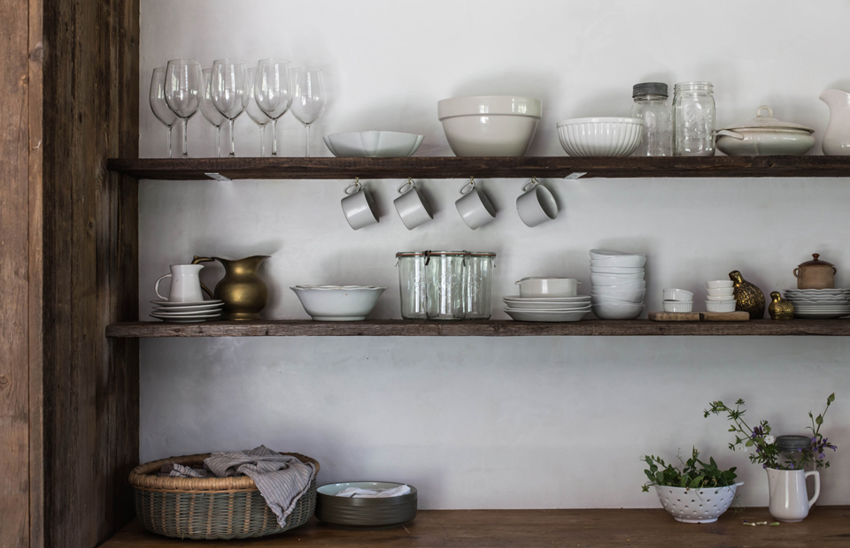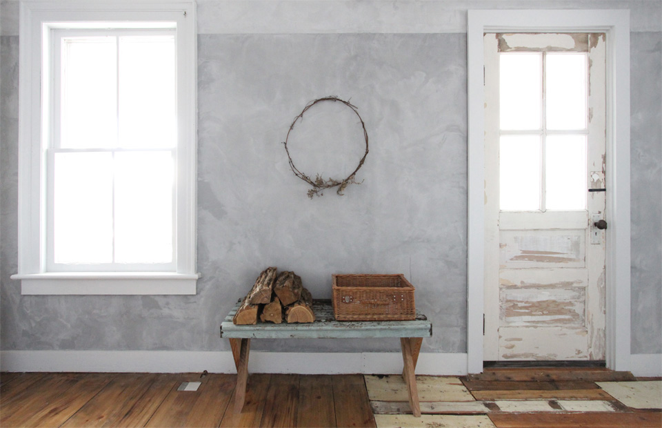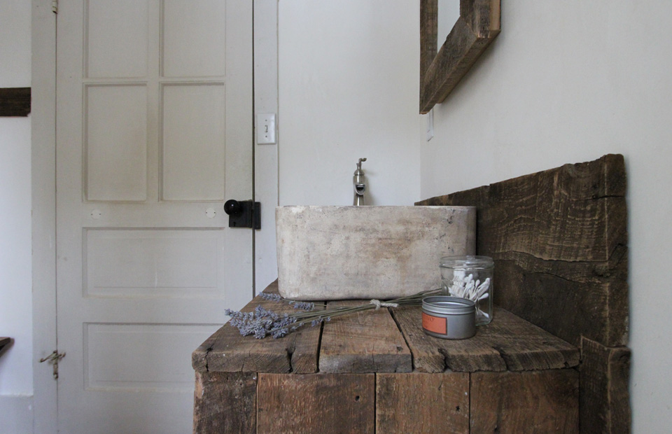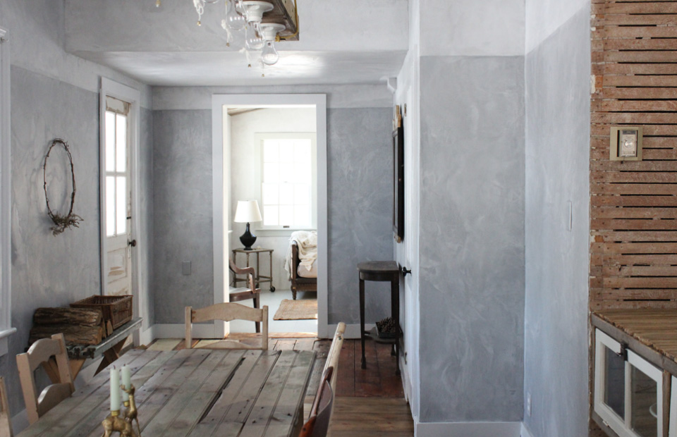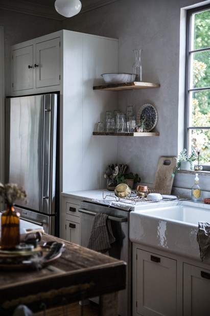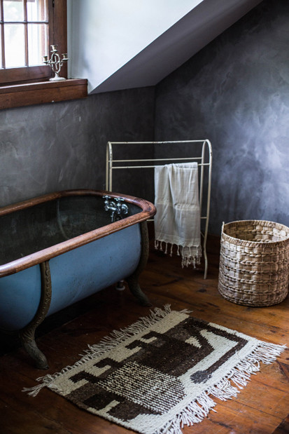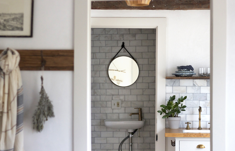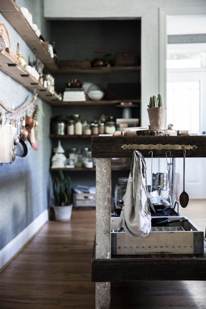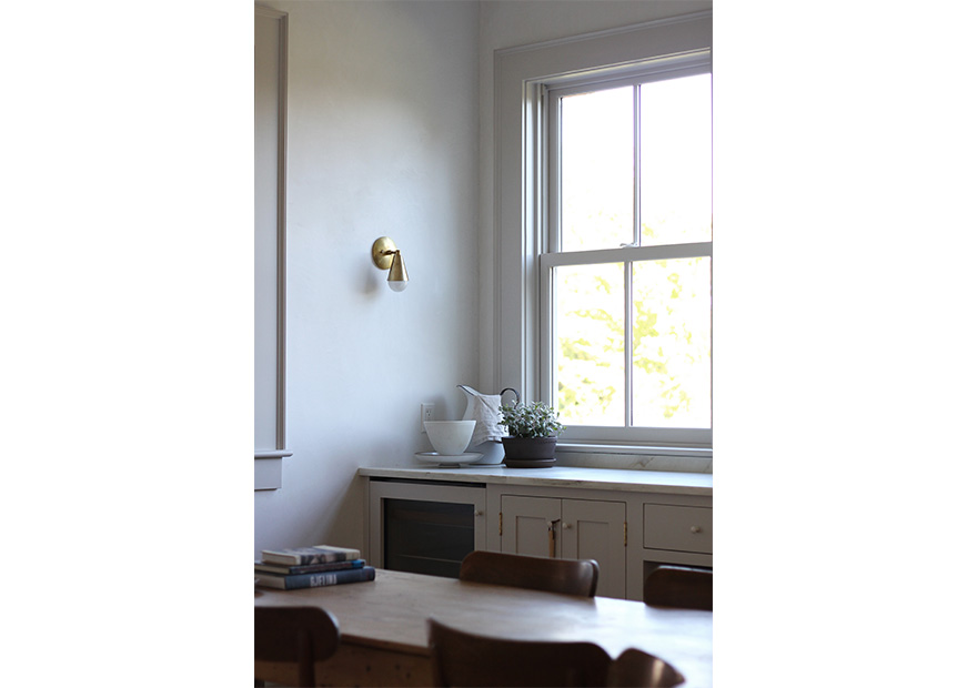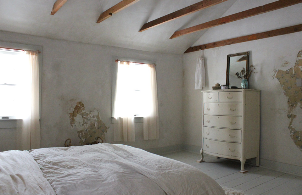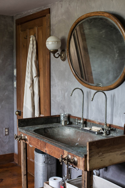 A kitchen decked out in orange granite countertops and other McMansion features is no place for Saveur’s Best Food Photography Blogger. Beth had pinned roughly a million images before we started working on the place, so we were really able to hit the ground running. We managed to keep the existing cabinet frames by altering them, making new doors, and giving everything a fresh coat of paint. We popped in a “new” old window and built a custom range hood, plus floating shelves from reclaimed late-19th-century factory beams, and an island and additional table from old barn siding. Beth went to Atlanta to pick out a slab of marble for the counters and had a beautiful Lacanche range delivered. Then we finished up with plastered walls (half polished, half hand combed), antique brass drawer pulls from Restore in Philadelphia, and a beautiful old French faucet Tara found on eBay.