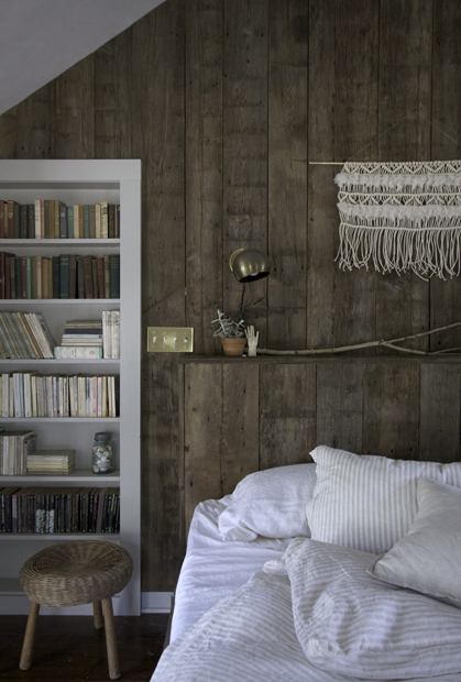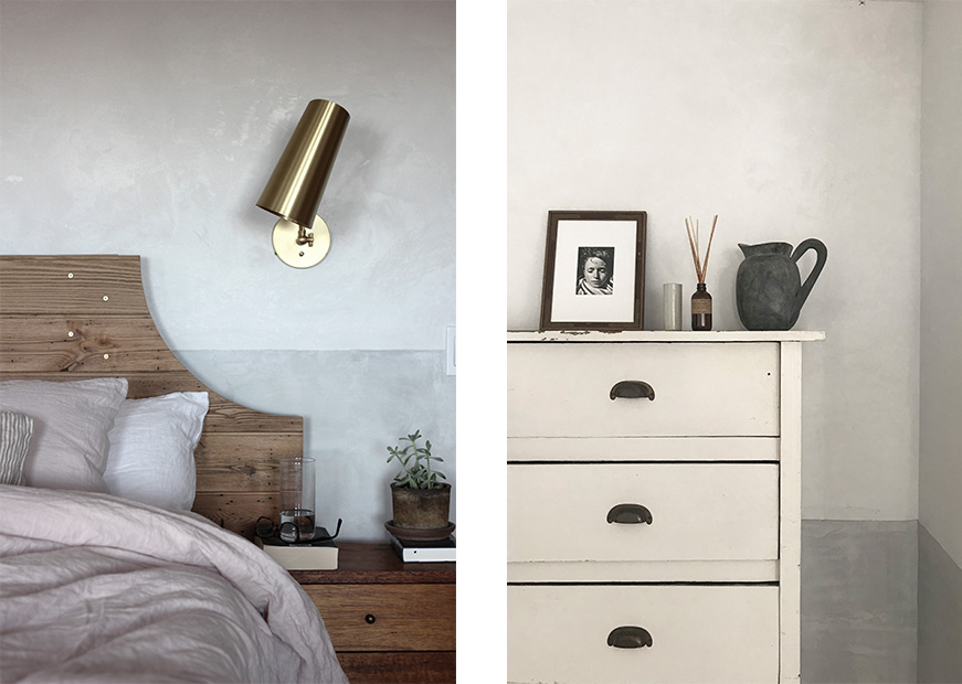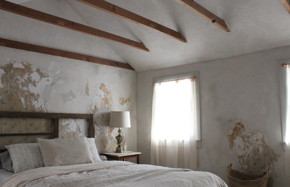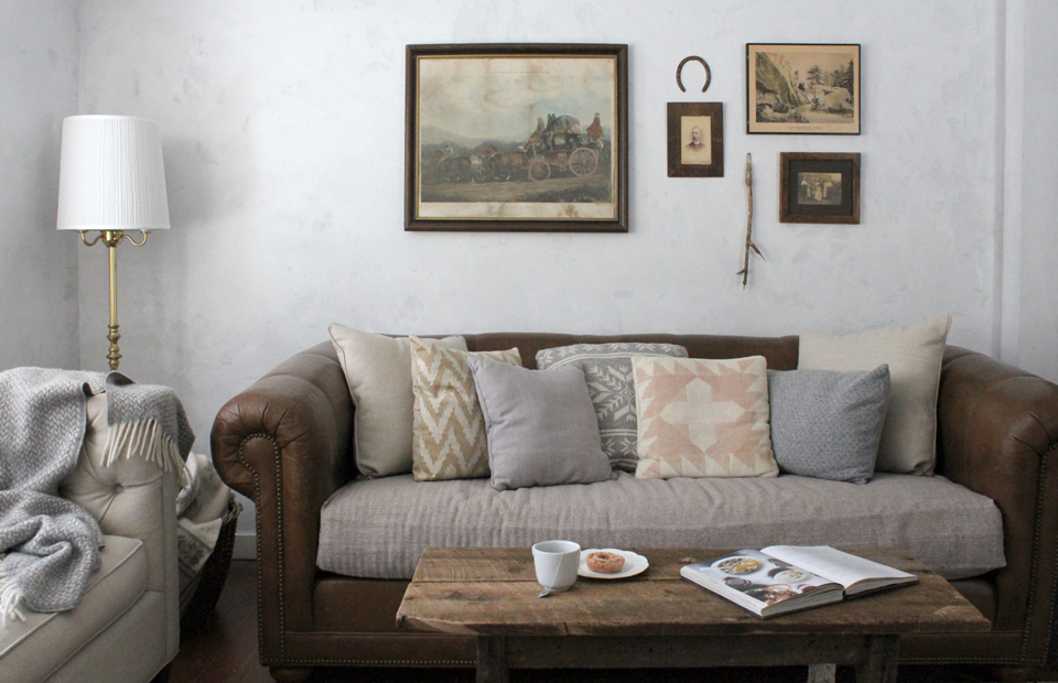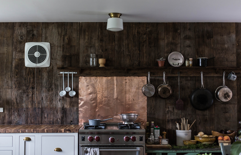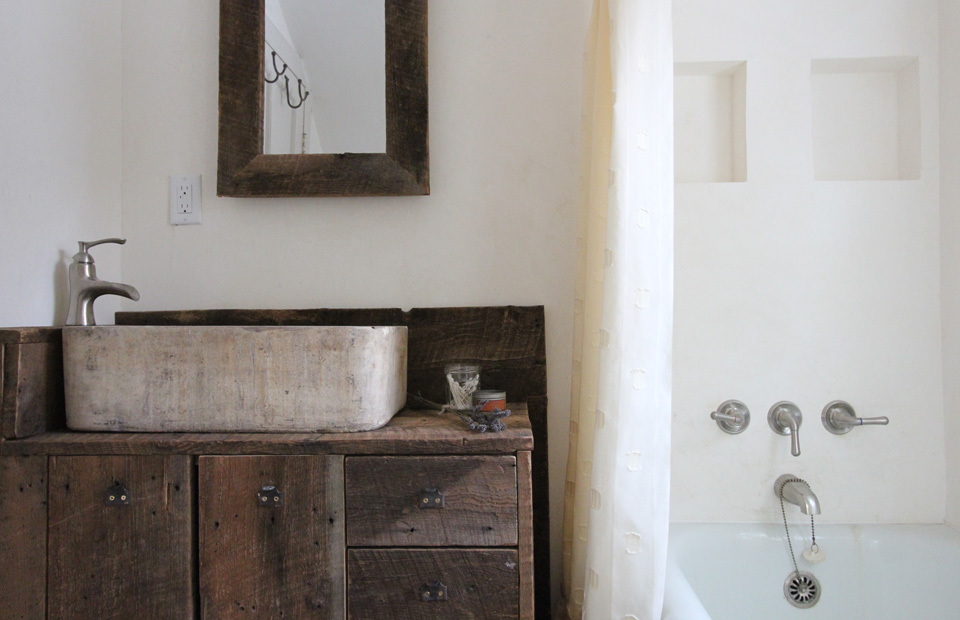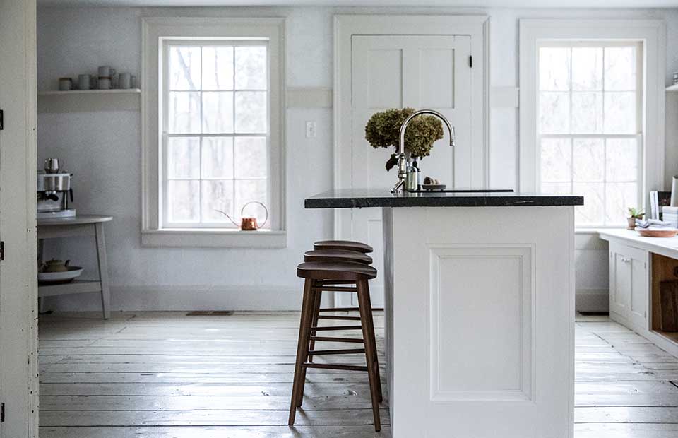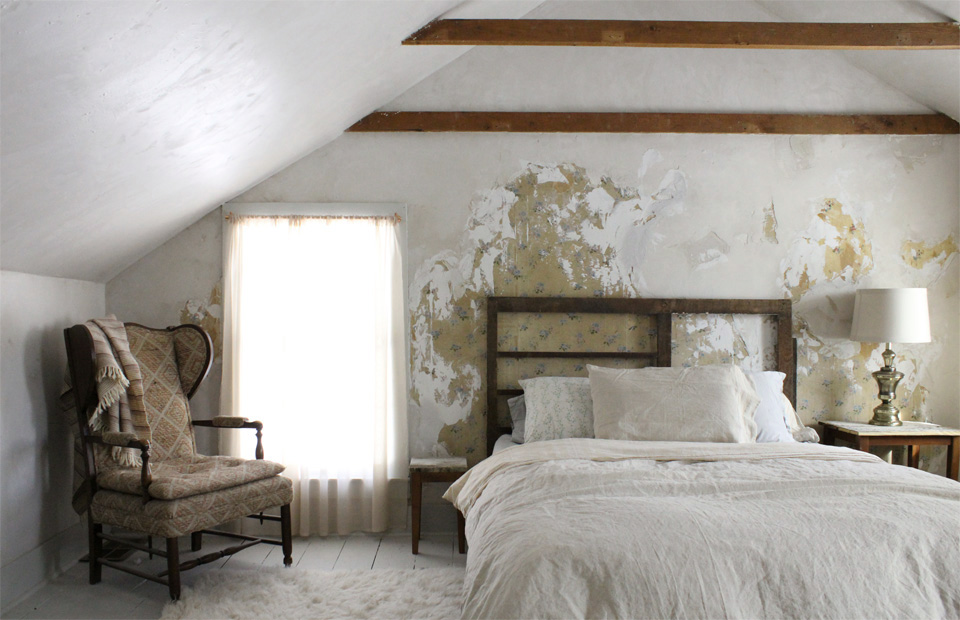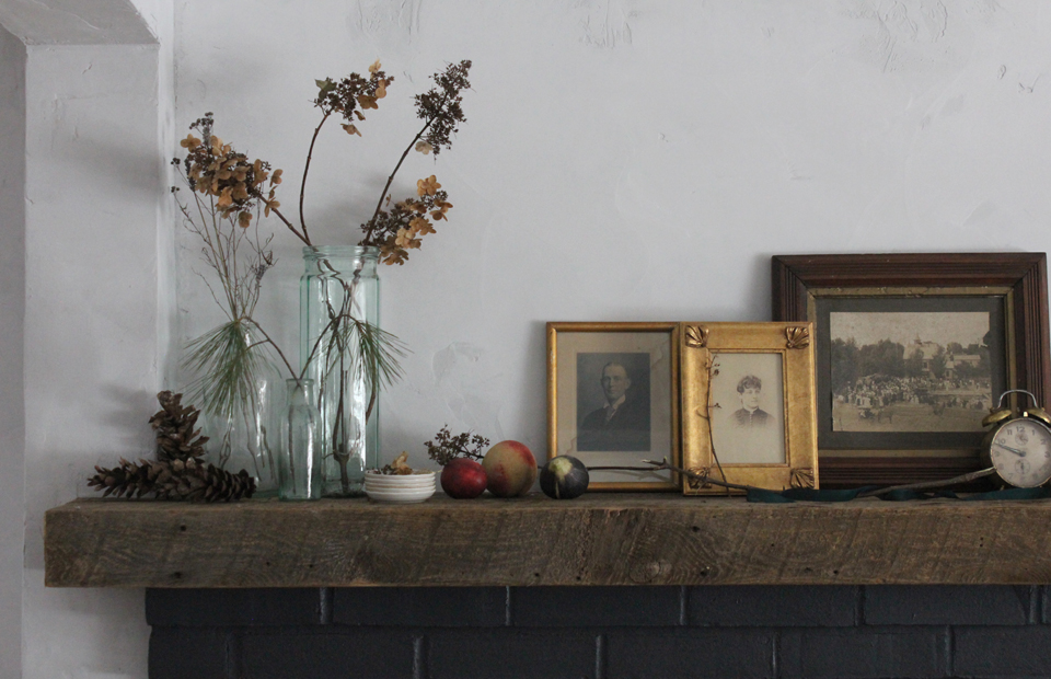 A kitchen decked out in orange granite countertops and other McMansion features is no place for Saveur’s Best Food Photography Blogger. Beth had pinned roughly a million images before we started working on the place, so we were really able to hit the ground running. We managed to keep the existing cabinet frames by altering them, making new doors, and giving everything a fresh coat of paint. We popped in a “new” old window and built a custom range hood, plus floating shelves from reclaimed late-19th-century factory beams, and an island and additional table from old barn siding. Beth went to Atlanta to pick out a slab of marble for the counters and had a beautiful Lacanche range delivered. Then we finished up with plastered walls (half polished, half hand combed), antique brass drawer pulls from Restore in Philadelphia, and a beautiful old French faucet Tara found on eBay.