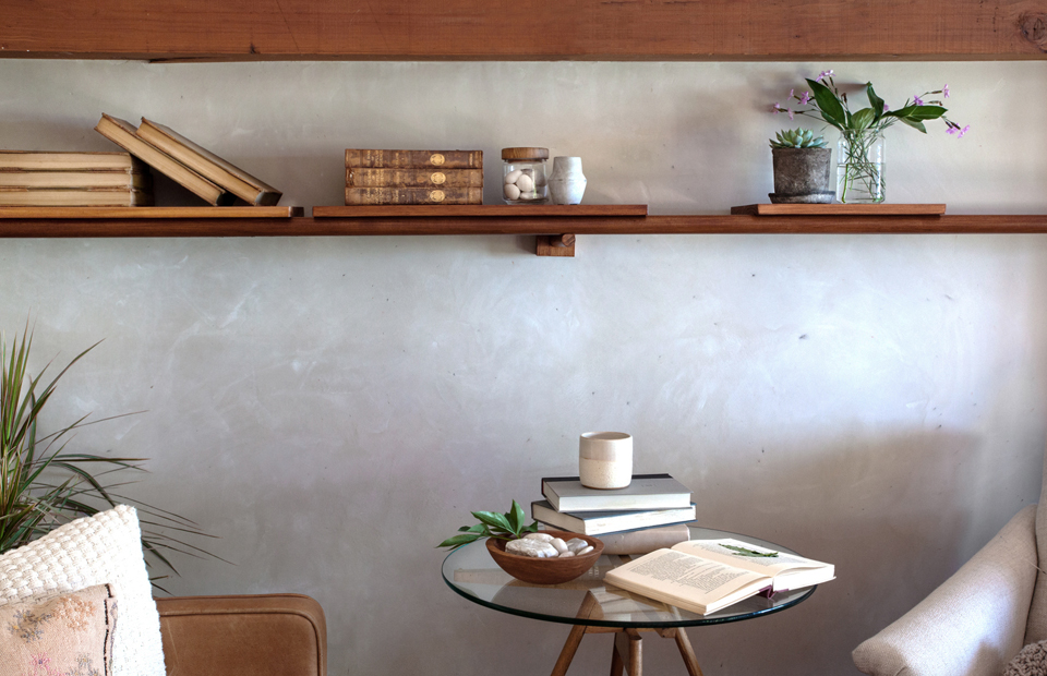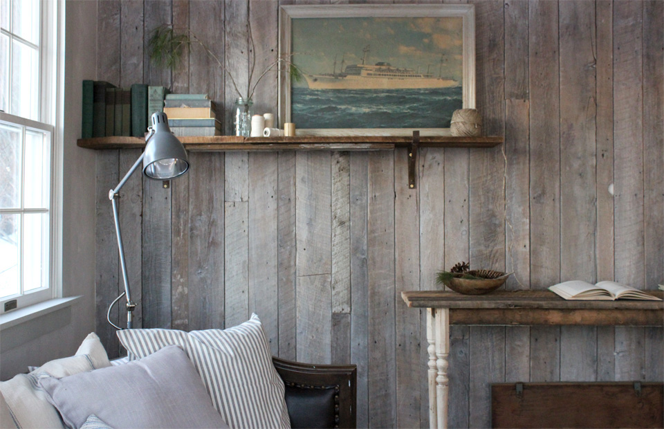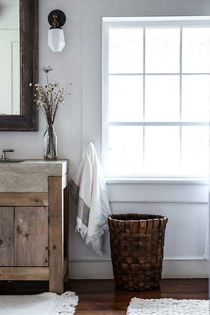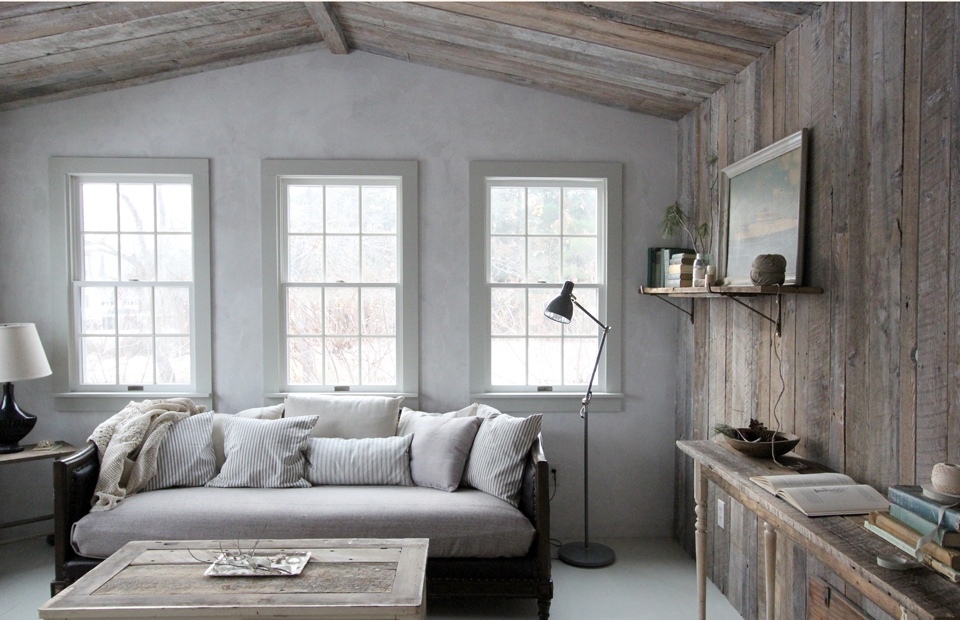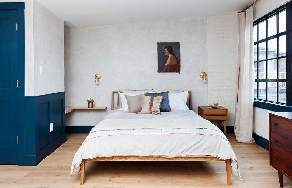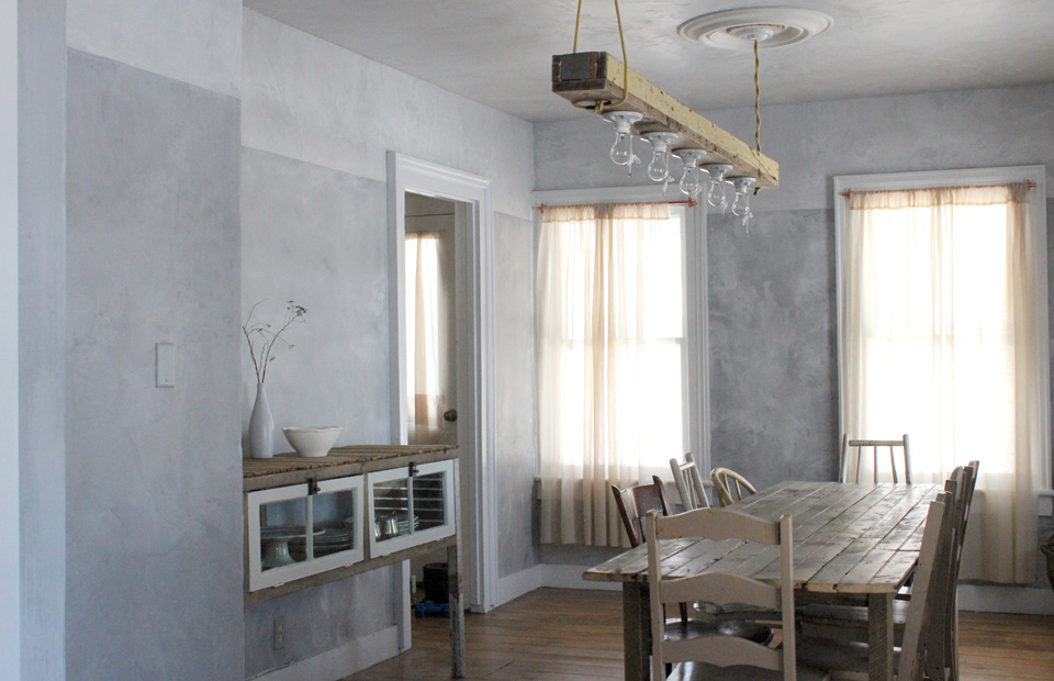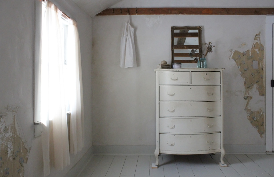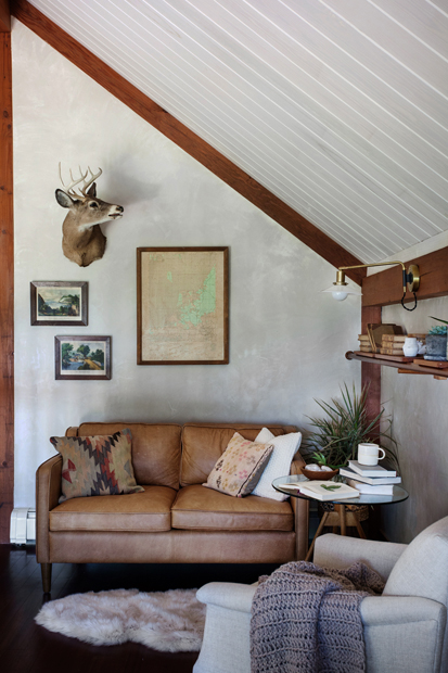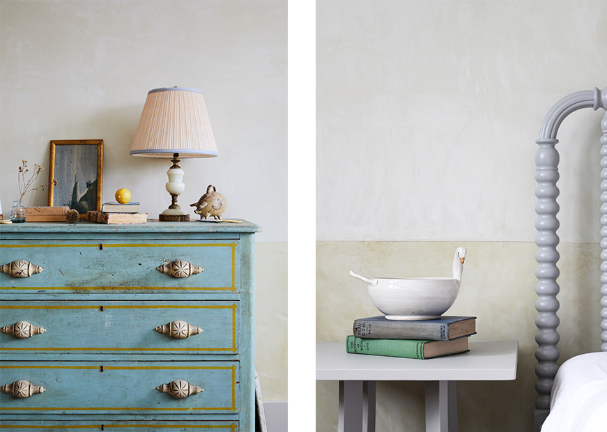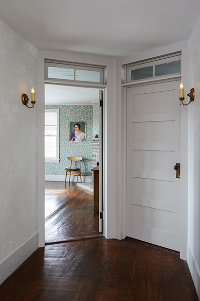 A kitchen decked out in orange granite countertops and other McMansion features is no place for Saveur’s Best Food Photography Blogger. Beth had pinned roughly a million images before we started working on the place, so we were really able to hit the ground running. We managed to keep the existing cabinet frames by altering them, making new doors, and giving everything a fresh coat of paint. We popped in a “new” old window and built a custom range hood, plus floating shelves from reclaimed late-19th-century factory beams, and an island and additional table from old barn siding. Beth went to Atlanta to pick out a slab of marble for the counters and had a beautiful Lacanche range delivered. Then we finished up with plastered walls (half polished, half hand combed), antique brass drawer pulls from Restore in Philadelphia, and a beautiful old French faucet Tara found on eBay.