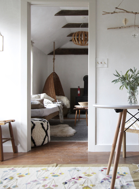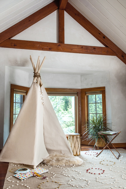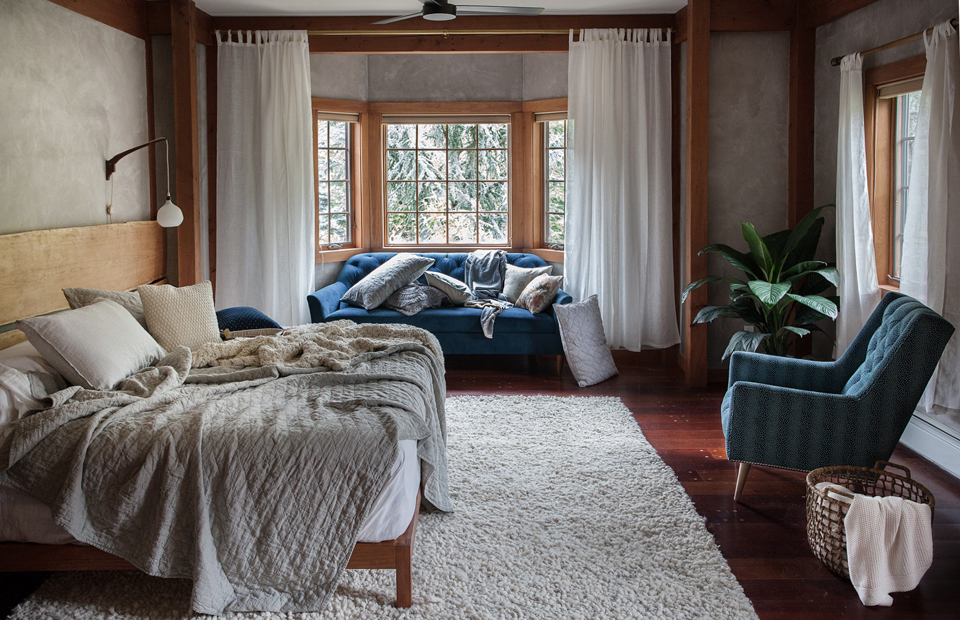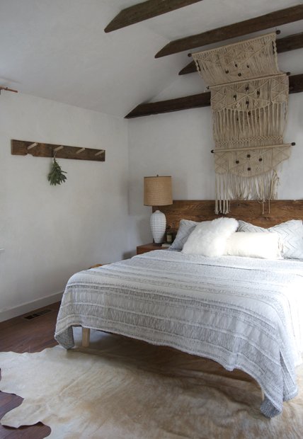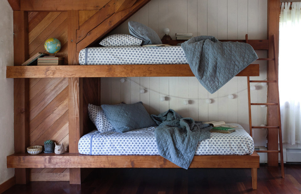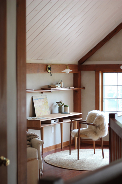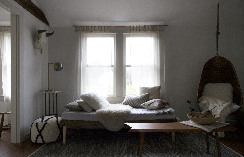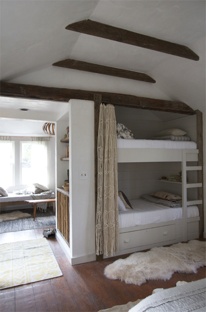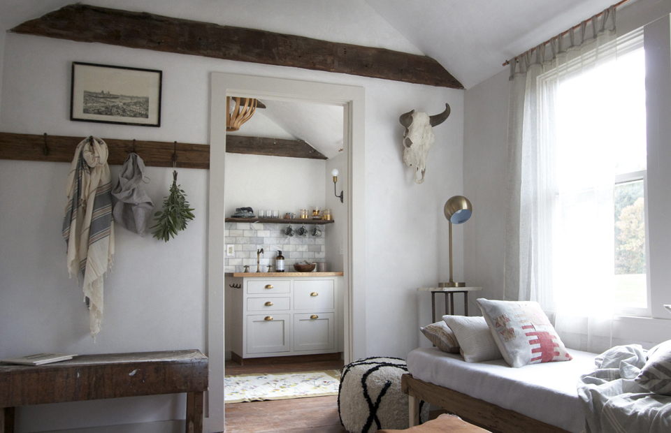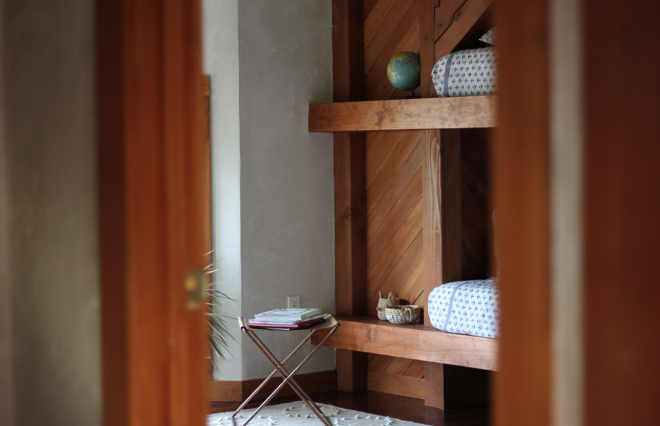 A little spot just over a little hill from the Magic Egg farmhouse. The guest house was filled with spiders and piles (and piles) of books when we got there, but it was easy to see the promise of this space. We let the original floors and wood beams steer the style, and kept things simple and light. Textured linens, white plaster, brass accents, some hanging sage from the garden, and of course, some built in bunk beds. It’s the perfect sized weekend getaway.