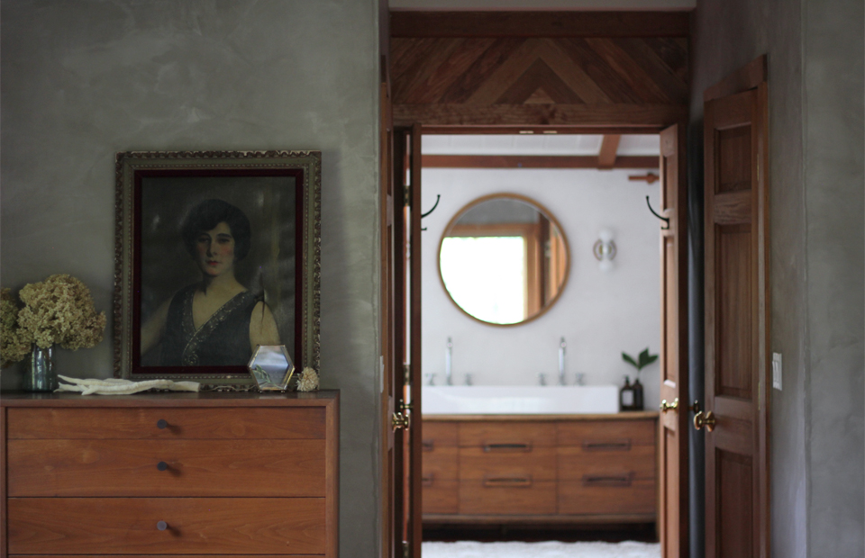 A couple of lovely clients with a couple of lovely houses on the Kinderhook Creek, Ali and Scott let us stay in their beautifully converted barn while fixing up the old farmhouse you see here. (We ended up redoing the barn too, while we were at it!) Original exposed joists, wide plan floors, and old built-in cupboards in the living room made our job easy. We just had to make sure everything we put back in felt as cool as the bones of the house itself: from the vintage chairs, leather sofa, and master bedroom closets, to the custom dining table, dry bar, bed frames, concrete vanities, and porch furniture built right in the garage.